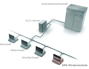 Bei Einsatz einer Fördersteuerung zum Behälter-/Palettentransport innerhalb des Lagers kann VC/2 auch die Steuerung des Warenflusses zwischen den Lagerbereichen übernehmen. Ladehilfsmitteln wird hierbei z.B. an einem Arbeitsplatz ein Auftrag zugeordnet, wonach sie zu allen anderen beteiligten Lagerbereichen gelenkt werden können. Hohe Flexibilität Von der preiswerten autarken Steuerung eines einzelnen Gerätes, über die Einzelplatzlösung mit Anbindung an einen Host bis hin zur Komplettlösung für die Integration mehrerer Lagerbereiche mit Warenflußsteuerung ist je nach Notwendigkeit eine flexible Systemauslegung möglich.
